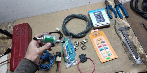 Для начала необходимо подобрать насос, подходящий под ваш тип ДВС и карбюратор. Помимо насоса необходимо будет приобрести 5-метровый шланг с диаметром около 8 миллиметров, дополнительное реле, сверлильный наконечник (3-4 миллиметра), топливный фильтр из инжекторных систем, топливный карбюраторный фильтр, 25-сантиметровая стальная трубка (стенка=0,8 диаметр=12), топливный шланг, переходной штуцер.