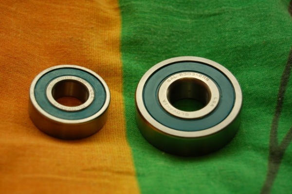 Размеры переднего подшипника (6303) – 17×47×14, у подшипника (6302) – размеры 15×42×13. Их отечественные «близнецы» обозначаются как 180302 и, соответственно, 180303 и называют их 303 закрытый, или 302 закрытый.