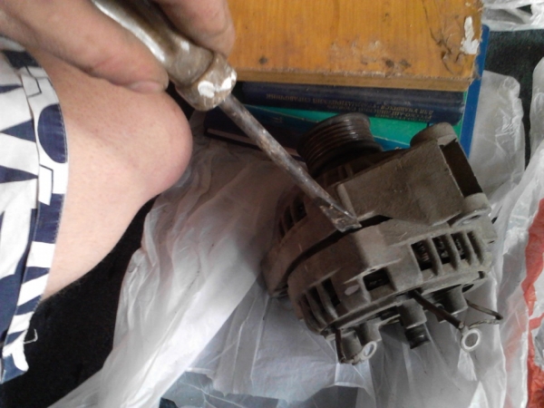 - Используя обычную отвертку или другой подручный инструмент, вам нужно заблокировать ротор генератора и открутить после этого шкив.