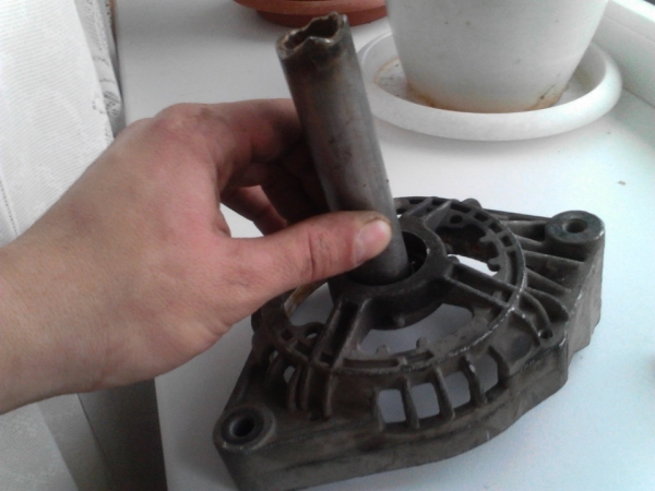 - Теперь возьмите головку, которой вы снимали передний подшипник, и старый извлеченный элемент генератора. С их помощью забивается на свое посадочное место новый подшип;